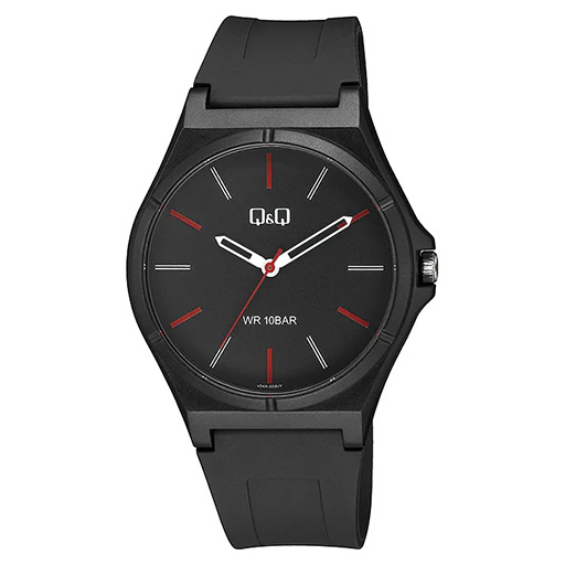 ساعت مچی مردانه Q&Q مدل V04A-003VY یک انتخاب فوقالعاده برای طرفداران طراحی ساده و اسپرت است. بدنه و بند هر دو از جنس رزین مشکی ساخته شدهاند که ضمن سبکی، مقاومت عالی در برابر ضربه و خراش فراهم میکنند.