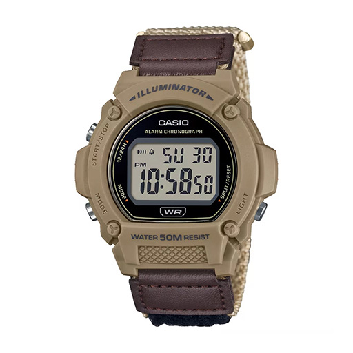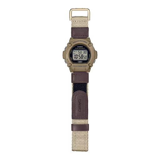 ساعت مچی کاسیو مدل W-219HB-5AVDF یک انتخاب خاص و متمایز در سری استاندارد کاسیو است که با الهام از طراحیهای نظامی و طبیعتگردی (Outdoor) ساخته شده است. بارزترین ویژگی این مدل، **بند پارچهای برزنتی** آن است که به جای قفلهای سگکی معمول، از مکانیزم چسبی (Velcro) بهره میبرد. این ویژگی باعث میشود تنظیم سایز ساعت روی مچ (بین 145 تا 215 میلیمتر) بسیار سریع و راحت باشد و حس راحتی فوقالعادهای را هنگام استفاده طولانیمدت منتقل کند.
