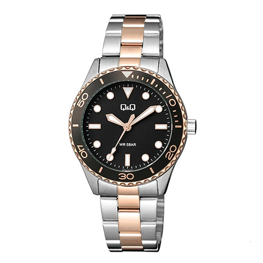ساعت مچی زنانه کیو اند کیو مدل Q55A-002PY یک نمونه عالی از ترکیب زیبایی کلاسیک و طراحی مدرن است. جذابترین نکته در طراحی این ساعت، استفاده از بند استیل **دو رنگ (Bi-color)** است که ترکیبی از نقرهای براق و جزئیات رزگلد میباشد. این ترکیب رنگی باعث میشود ساعت هم با زیورآلات نقره و هم با طلا به راحتی ست شود. صفحه نمایش **مشکی** رنگ این مدل، تضاد بسیار زیبایی با بدنه و عقربههای روشن ایجاد کرده که علاوه بر افزایش خوانایی، جلوهای لوکس و رسمی به ساعت بخشیده است.