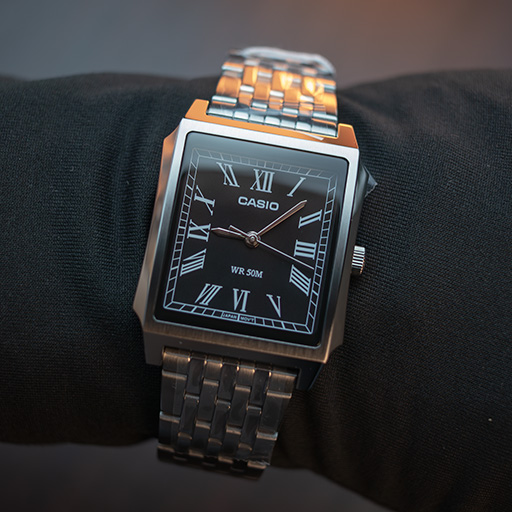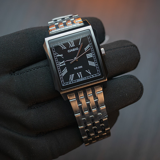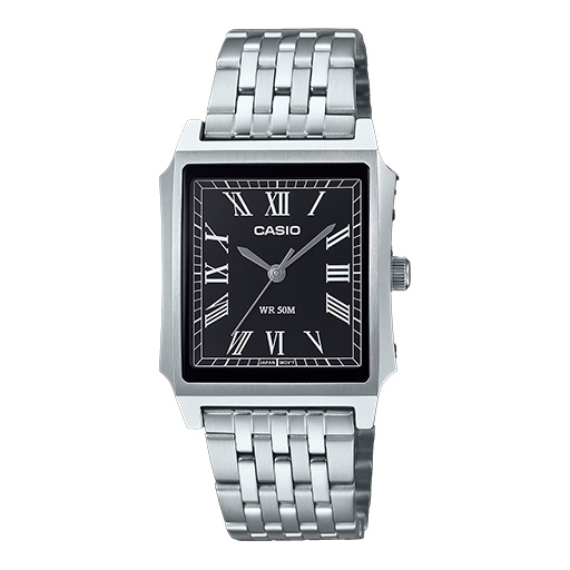 ساعت کاسیو MTP-B190D-1BV یک انتخاب ایدهآل برای آقایانی است که به دنبال سادگی محض و تقارن در طراحی هستند. برخلاف بسیاری از مدلها، این ساعت فاقد نمایشگر تاریخ است که باعث شده صفحه مشکی آن بسیار خلوت، مینیمال و خوانا باشد. قاب مستطیلی این مدل با ابعاد ۳۱.۵ میلیمتر، نه خیلی بزرگ است و نه خیلی کوچک، و به خوبی روی مچ مینشیند. بند استیل این مدل بر خلاف سریهای سبکتر، دارای قفل «سهتاشو ضامنی» است که باز و بسته کردن آن را بسیار راحت و ایمن میکند. وزن ۹۷ گرمی ساعت حس استحکام و کیفیت خوبی را به کاربر منتقل میکند و مقاومت ۵۰ متری آب، خیال شما را بابت استفاده روزمره راحت میسازد.