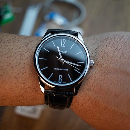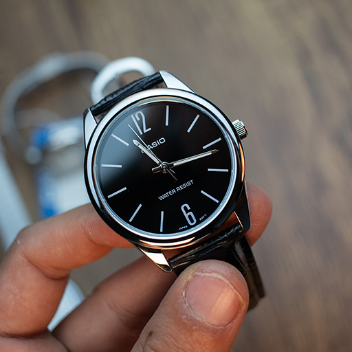 استفاده از بند چرمی مشکی با بافت کلاسیک و قفل سگکی، راحتی استفاده در طولانی مدت را تضمین میکند و وزن کلی ساعت را در عدد بسیار سبک **۴۶ گرم** نگه داشته است. ضخامت کم بدنه (**۸.۱ میلیمتر**) باعث میشود ساعت به راحتی زیر آستین پیراهن قرار گیرد و مزاحمتی ایجاد نکند. از نظر مقاومت در برابر آب، این مدل در رده **Water Resistant** قرار دارد، به این معنی که در برابر قطرات باران و شستشوی دست مقاوم است اما برای شنا یا غوطهوری در آب طراحی نشده است. شیشه معدنی مقاوم و عمر باتری ۳ ساله، از دیگر ویژگیهای این ساعت مقرونبهصرفه ژاپنی است.