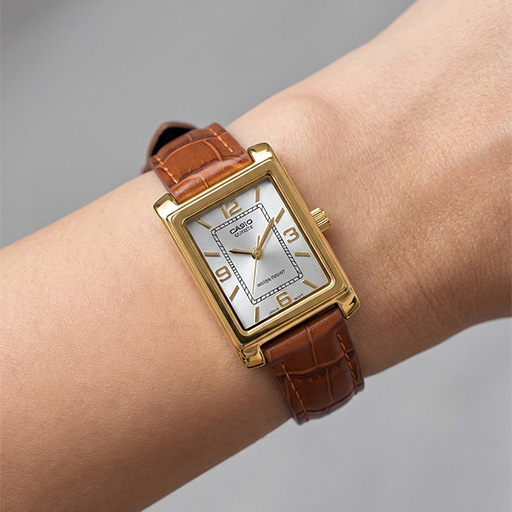 مدل LTP-1234GLL-7A نسخهی لوکس و مجلسیتر از سری محبوب ۱۲۳۴ است که با رنگ طلایی (Gold Tone) خود، جلوهای درخشان و خیرهکننده پیدا کرده است. قاب مستطیلی و کشیده این ساعت که اصطلاحاً فرم “Tonneau” (بشکی) دارد، یادآور ساعتهای کلاسیک و گرانقیمت قدیمی است. ترکیب این قاب طلایی با بند چرم طبیعی باکیفیت، استایلی باوقار و رسمی ایجاد کرده که برای مهمانیها و پوششهای رسمی ایدهآل است. با وجود ظاهر لوکس، این ساعت بسیار سبک (۲۵ گرم) بوده و راحتی استفاده در طولانی مدت را تضمین میکند.