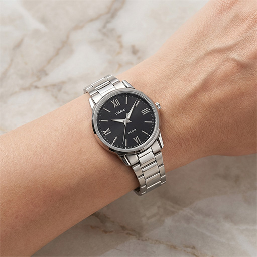 ساعت کاسیو LTP-1303DD-1AV یک انتخاب هوشمندانه برای بانوانی است که به دنبال یک ساعت روزمره و بادوام با ظاهری مینیمال هستند. این مدل بر خلاف نسخه چرمی، از بند استیل ضد زنگ بهره میبرد که طول عمر بالاتر و درخشش بیشتری دارد. صفحه مشکی ساعت با عقربهها و نشانگرهای ساده نقرهای، کنتراست زیبایی ایجاد کرده و خوانایی زمان را بسیار راحت میکند. قاب ۳۰.۵ میلیمتری آن اندازهای استاندارد دارد که روی اکثر مچها به زیبایی مینشیند. ویژگی مهم این ساعت، مقاومت ۵۰ متری در برابر آب است که نگرانی شما را بابت نفوذ آب هنگام شستشوی دست یا باران برطرف میکند.