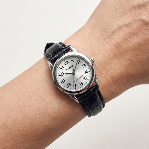 ساعت مچی زنانه کاسیو مدل LTP-V001L-7B یکی از ظریفترین و کلاسیکترین مدلهای این برند ژاپنی است که با عرض قاب ۲۵ میلیمتر، بهطور خاص برای بانوانی طراحی شده که مچهای ظریفی دارند یا به ساعتهای کوچک و غیرتجملاتی علاقهمندند. صفحه نقرهای این ساعت با طراحی ساده و اعداد خوانا، حس پاکیزگی و نظم را منتقل میکند و ترکیب آن با بند چرمی مشکی (یا دودی تیره)، کنتراستی جذاب و رسمی ایجاد کرده است.
