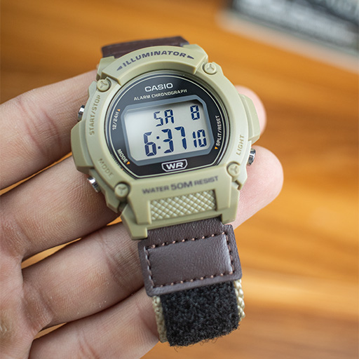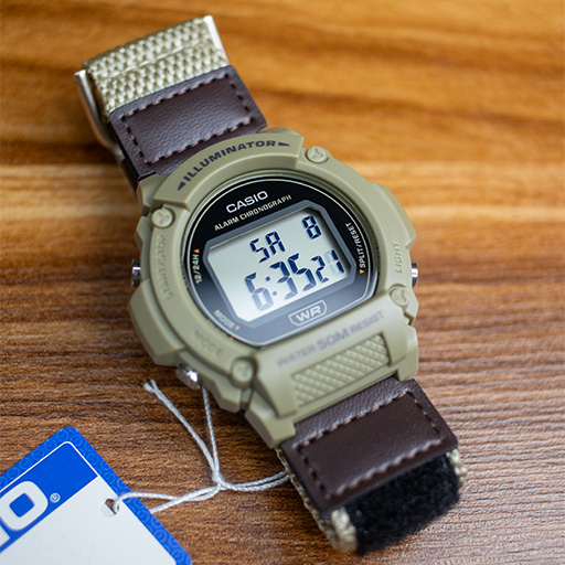 ساعت مچی کاسیو مدل W-219HB-5AVDF یک انتخاب خاص و متمایز در سری استاندارد کاسیو است که با الهام از طراحیهای نظامی و طبیعتگردی (Outdoor) ساخته شده است. بارزترین ویژگی این مدل، **بند پارچهای برزنتی** آن است که به جای قفلهای سگکی معمول، از مکانیزم چسبی (Velcro) بهره میبرد. این ویژگی باعث میشود تنظیم سایز ساعت روی مچ (بین 145 تا 215 میلیمتر) بسیار سریع و راحت باشد و حس راحتی فوقالعادهای را هنگام استفاده طولانیمدت منتقل کند.